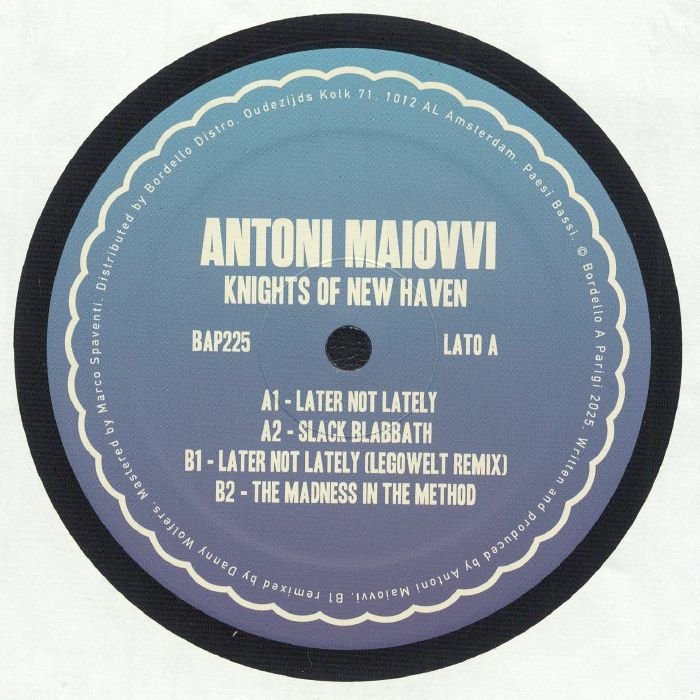 Antoni Maiovvi flaunts an aerated, sunspotty sound on ‘Knights of New Haven’, blending Ned West Coast influences and US machine music. ‘Later Not Lately’ pulses with light kicks and ruffling hi-hats, echoing Chicago house and flavoursome tech trance; Legowelt (Danny Wolfers) reimagines it with serrated snares and a gritty TB-303 bassline. ‘Slack Blabbath’ weaves staggered synths and sharp percussion, and closer ‘The Madness In The Method’ swirls static-laced drums around eerire bass, balancing Maiovvi’s horror-disco roots with bold house rhythms. This EP is a dark, driving, and grand fusion of electronic styles, veering increasingly crushy and redux-happy. Legowelt’s snare is especially oomphy, and the closer’s synths especially brooding.