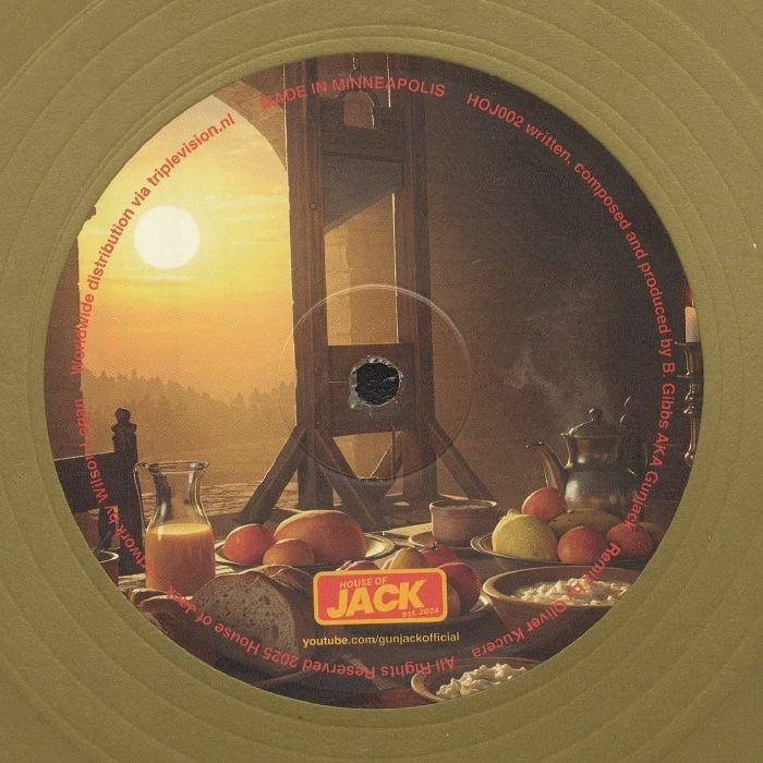 LA’s Brian Gibbs aka Gunjack’s second outing on his own House Of Jack label comes with Breakfast At The Guillotine, a short, six-track LP on limited gold vinyl. Now based in the city of Angels but with roots in Berlin’s techno underground, Gunjack has long toyed with custom-modified gear, pulling apart vintage synths and bending FM engines into jagged new textures. The record leans into that process, fusing grit and precision in equal measure, title cut rattling with rickety weight, while Oliver Kucera – known from Djax and R&S – reworks the material with his own hard-edged flair.