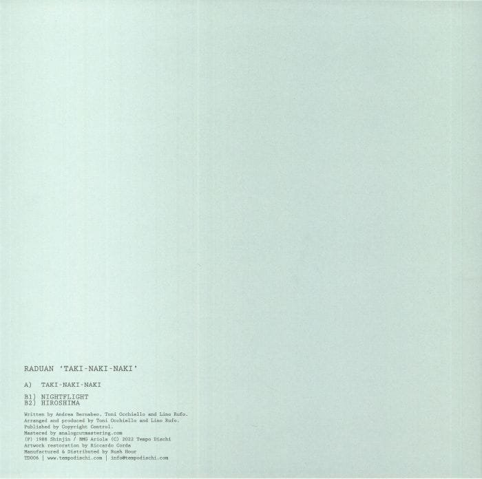 The sixth release on Italian imprint Tempo Dischi comes from Alessandro Bernabeo, aka Raduan, the Italian DJ and producer behind ‘Taki-Naki-Naki’, one of the most eclectic and unconventional electronic records made in Italy in the late 1980s.