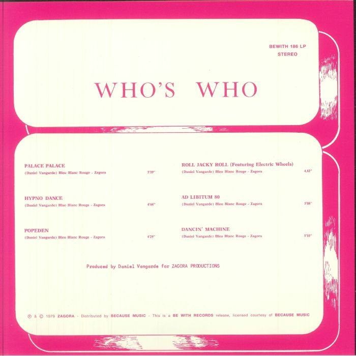 For their latest red-hot reissue, the admirable Be With Records takes us back to Paris in 1979 and the sole album by Who’s Who – one of the numerous aliases of songwriter, musician and producer Daniel Bangalter, AKA Thomas Bangalter of Daft Punk’s dad. The apple doesn’t fall far from the tree, right? The six tracks showcased on the eponymous set are very in keeping with French disco of the period, with attractive (and then cutting edge) synthesiser sounds being combined with glassy-eyed male and female vocals, infectious «walking» basslines and Cerrone-esque drums. Highlights are plentiful, from the peak-time disco joy of the tropical-tinged «Palace Palace», the Moroder/Patrick Cowley-influenced mid-tempo spaciness of ‘Hypno Dance’, to the Tata Vega style jauntiness of ‘Roll kacky Roll’ and the fantastic ‘Dancin’ Machine’.